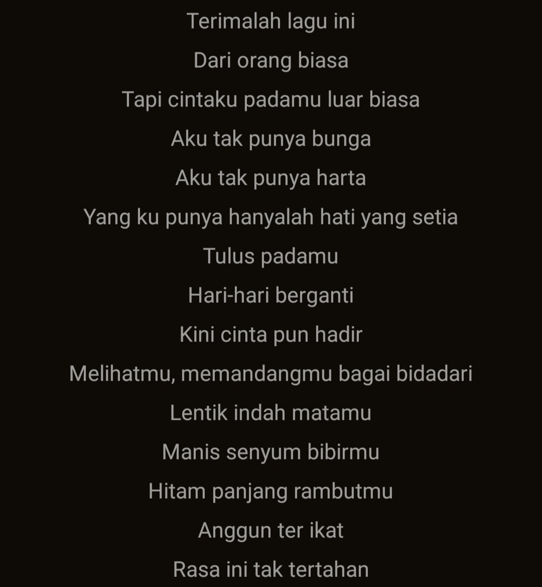 Aku tak punya bunga aku tak punya harta Tapi aku hanya punya cinta yg luar biasa. Aku tak punya bunga Aku tak punya harta Yang kupunya hanyalah hati yang setia Yang kupunya hanyalah hati yang setia Terimalah cintaku yang luar. Terimalah lagu ini dari orang biasa.